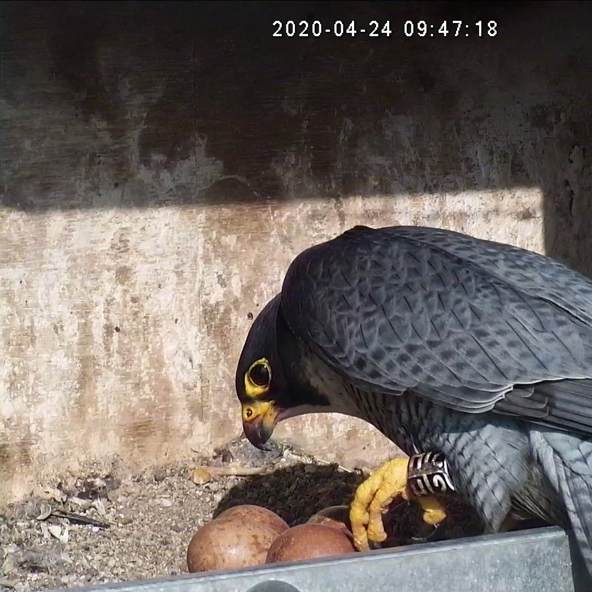Ce printemps, les règles de confinement liées à la pandémie de covid 19 ont quelque peu perturbé la mise en route du système d’enregistrement et de connexion du nid de Woluwe-Saint-Pierre. On ne sait donc pas exactement quand les faucons ont commencé à couver. Il n’est donc pas possible d’évaluer la date d’éclosion. On sait par contre que le mâle est toujours celui d’Etterbeek. Il a donc 8 ans ce printemps. Sa femelle est toujours non-baguée. On peut postuler qu’il s’agit de la même depuis la première nidification en 2014. Mais il est tout aussi possible qu’elle ait été remplacée par une autre femelle non-baguée.